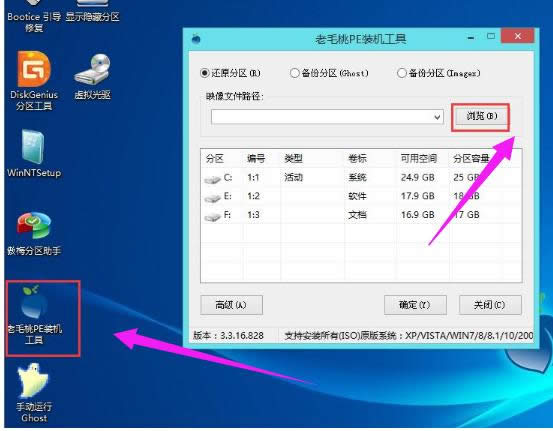 登录pe系统后,鼠标左键双击打开桌面上的老毛桃PE装机工具,然后在工具主窗口中点击“浏览”按钮