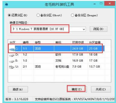 随后我们根据需要在映像文件路径下拉框中选择win7系统其中一个版本(这里,以win7系统家庭普通版为例),接着在磁盘分区列表中选择C盘作为系统盘,然后点击“确定”按钮即可