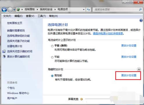 3,第三步进去电源选项界面之后,选择高性能,点击旁边的更改计划设置,如下图所示: