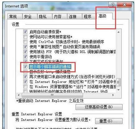 打开之后就点“高级”,然后在设置项中滑动滑块,找到如图所示两项,并选中“显示每个脚本错误的通知“并取消勾选显示友好HTTP错误通知“的选中状态,然后点”确定“。