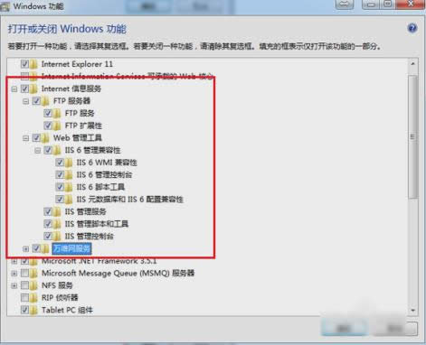 3.点进去之后,可以看到Internet信息服务默认是没有勾选的,然后把“Internet信息服务”里面的“ftp服务器”,“web管理工具”,“万维网服务”全部勾选上,再点确定即可。