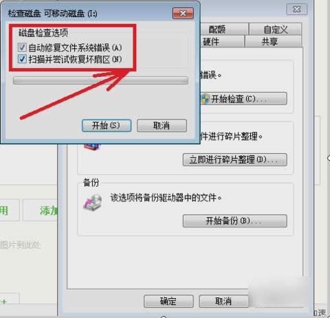 接下来选中“自动修复文件系统错误”、及“扫描尝试恢复坏扇区”,然后点“开始”。