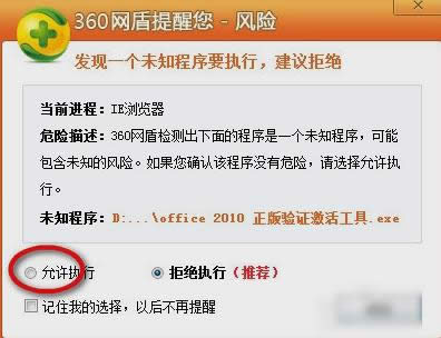 首先,下载并安装了“office2010正式版激活工具”后,点击打开,这时候电脑一般安装有安全卫士的都会防护,这里点击允许程序运行,再点确定。