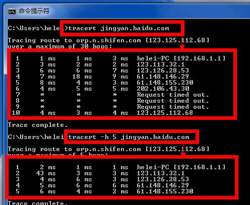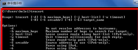 在“tracert”命令与IP地址或URL地址中间输入“-h”,并在之后添加一个数字,可以指定本次tracert程序搜索的最大跳数。加入“ -h 5 ”后,搜索只在路由器间跳转5次,就无条件结束了。