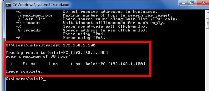在命令行中输入“tracert ”并在后面加入一个IP地址,可以查询从本机到该IP地址所在的电脑要经过的路由器及其IP地址。下图中后面的IP地址为同一个路由器下的局域网中的另一个电脑的IP地址。