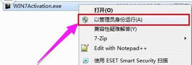 进入刚刚解压的WIN7 Activation文件夹,里面会有一个WIN7Activation.exe的文件,对着这个文件点击鼠标右键,选择“以管理员身份运行”