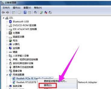 在设备管理器页面找到“网络适配器”下面一般有两个网卡,一个有线一个无线网卡!点击有线网卡右键--禁用