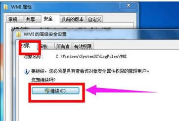 在WMI文件夹属性页面,选择安全选项卡--点击高级设置