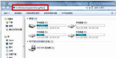 日志文件的路径C:\Windows\System32\LogFiles\WMI,这个文件夹如果没有管理员权限,宽带连接也会有问题,出现651或711等错误提示的!首先双击计算机,进入计算机文件夹,在地址栏输入C:\Windows\System32\LogFiles后回车