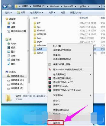 在LOgFiles文件夹下找到WMI文件夹,然后选中点击右键--属性,如下图所示i!其实就是让它获得永久管理员权限!我的方法可以不用每次重启电脑后都要修改一次权限