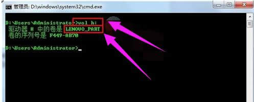 在打开的命令窗口中,首先获取要转换的磁盘的卷号:输入命令“vol h:”(其中H:表示H盘)并按回车键,就可以查看到对应磁盘的卷号。