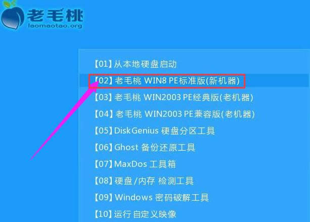 接着移动光标选择“【02】老毛桃WIN8 PE标准版(新机器)”,按回车键。