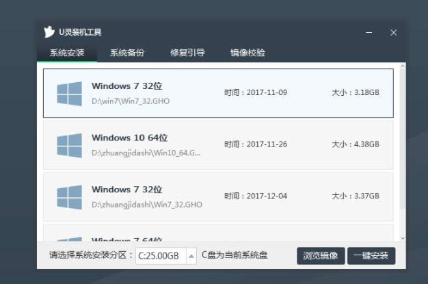 进入pe后会自启U灵pe装机工具,您可以在界面中选择已经扫描出的系统,