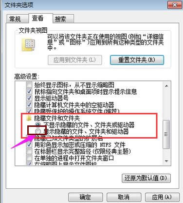 取消“隐藏受保护的操作系统文件”前面的方框里的勾,再点击“显示隐藏的文件、文件夹和驱动器”小圆点。点击确定