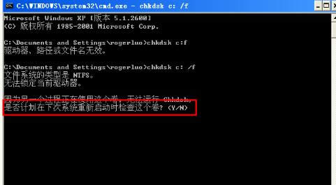 在执行检测前该盘中有正在使用的文件时,会出现下面的提示,即是本次不能执行检测,选择Y,可以在下次开机时进行检测。