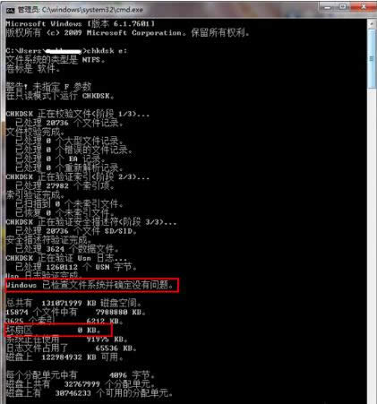 如果没有正在被使用的文件,则可以执行检测,且系统会在相应地方告诉你是否已有文件系统错误,以及坏扇区的大小。
