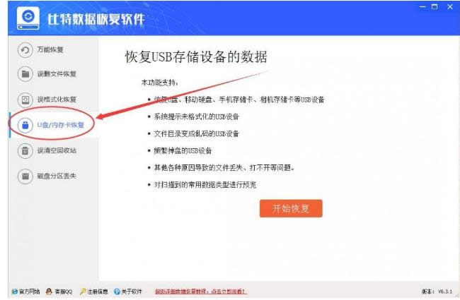 打开比特数据恢复工具,在主界面点击相应的恢复模式。鼠标停留在功能按钮可查看功能详情。