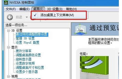 打开“NVIDIA控制面板”后在窗口的左上方点击“桌面”然后把“添加桌面上下文菜单”勾选上。这样以后就可以在桌面的空白处鼠标右键就能找到。