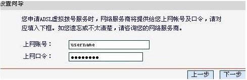 7,点击下一步后,出提示输入上网的账号和密码,这是申请宽带时候给的。