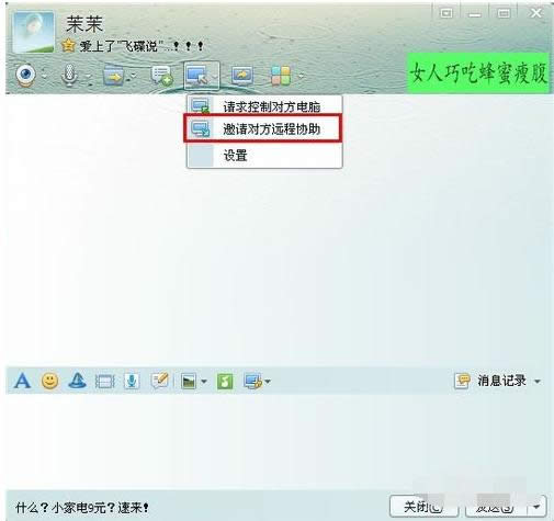 3, 选择对话框上方的一个电脑图标,然后点击,有三个选择,第一个是您申请远程控制对方电脑。