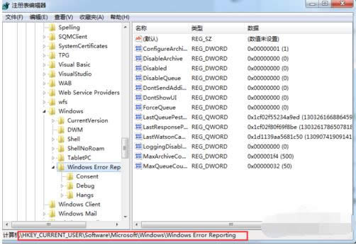 3,依次展开:HKEY_CURRENT_USER\Software\Microsoft\Windows\Windows Error Reporting