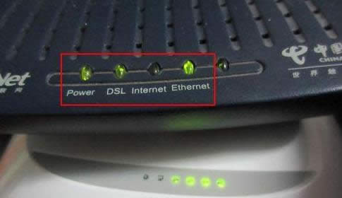 2、检查猫(modem)或路由器的状态指示灯,在上面的就是猫(modem),我们看,正常的是三个指示灯亮的,第一个Power这个就是电源指示灯,第二个DSL就是输出的网线,第四个就是接入的那条电话线,哪个不亮的你就检查哪个。(说明下,如果猫直接接入电脑的,那就是internet灯亮,我这个是接入路由器的,所以是DSL灯亮)