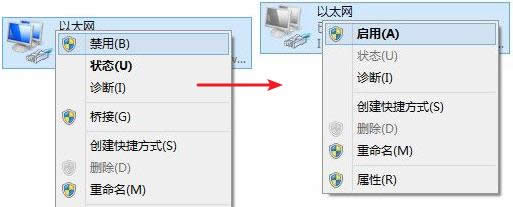 3、鼠标右键相应网络连接,选择“禁用”,当连接变为灰色后再右击相应连接,选择“启用”,下图所示: