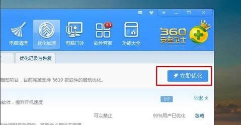 6.点击“优化加速”,然后在界面中点击“立即优化”,完成开机启动项的优化,对电脑的关机速度也起到一定作用。