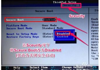 进入BIOS后,选择Security这一项,然后在其项下选择“Secure Boot”,将这一项设置为Disabled,意思是关闭此项。