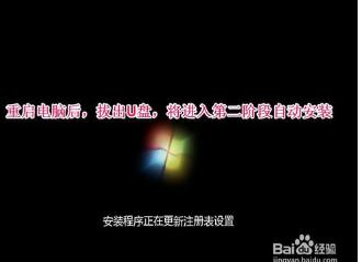 如果之前是在BIOS中设置从U盘启动,这时就要再次进入BIOS,把从U盘启动修改为从硬盘启动,按F10保存后,重启就会从硬盘启动,进行第二阶段系统安装。