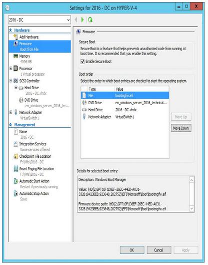 在上图中你可能会注意到的第一个地方就是与第1代虚拟机不同,第2代虚拟机没有BIOS容器。为访问这些设置,你必须在Hyper-V Manager中右键单击虚拟机然后在弹出的菜单中选择设置命令。BIOS设置在虚拟机的固件容器内是可用的。