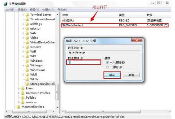 在右侧窗口中找到“ WriteProtect ”表,双击打开WriteProtect将数值数据改为“0”结束操作。