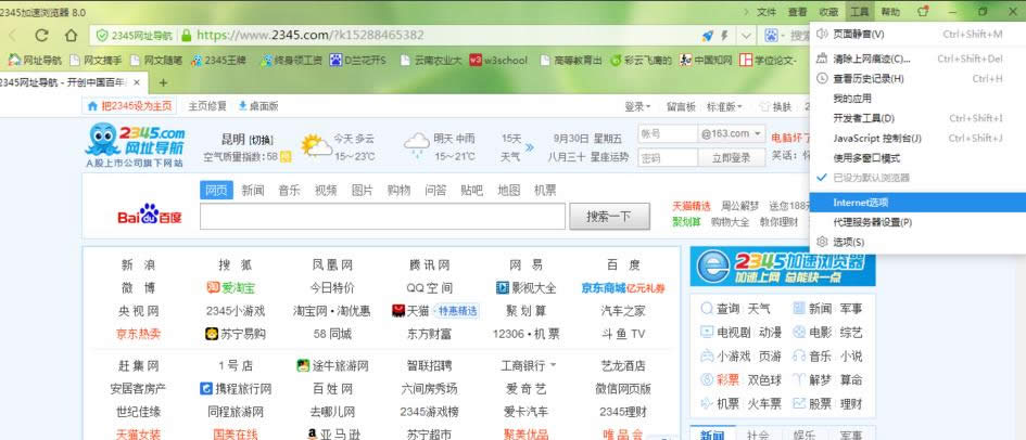 1.打开网页,点击菜单栏里的工具,找到Internet选项。