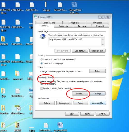 2.点击Internet中间的临时文件选项(历史记录),点击删除按钮,并删除所有脱机内容。