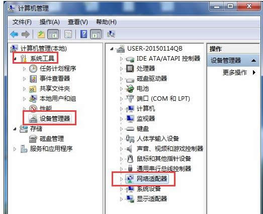 打开“计算机管理”窗体后,依次定位到“系统工具 -》 设备管理器 -》 网络适配器”