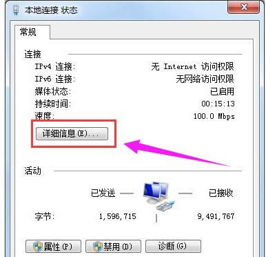 首先,进行如下的操作:点击“详细信息”,然后点击本地连接状态中的详细信息选项。