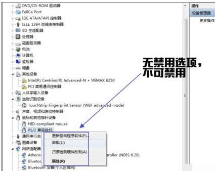 我的电脑,右键选中“管理”进入“设备管理器”找到鼠标,可以看到两个设备,一个是USB鼠标,另一个是ps/2,Win7系统识别笔记本的触控板。