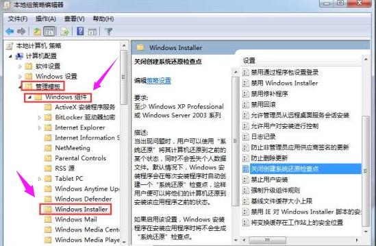 回车打开本地组策略编辑器,依次展开到计算机配置-管理模板-Windows组件-Windows Installer,在右侧找到关闭创建系统还原检查点,双击打开设置为已启用