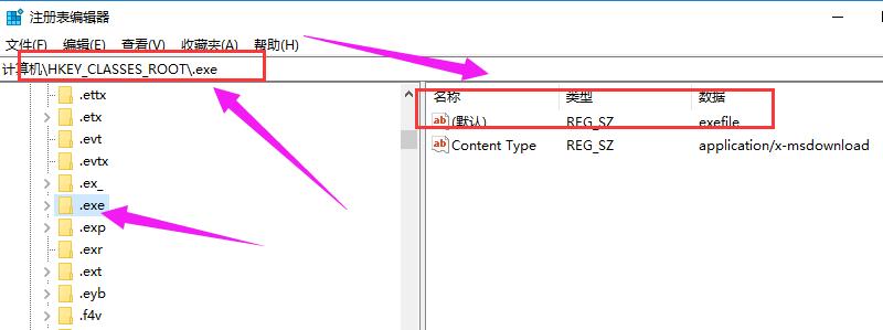 进入注册表之后,按照下面路径寻找:HKEY_CLASSES_ROOT.exe,确保右边的默认值为:exefile,否则进行修改。