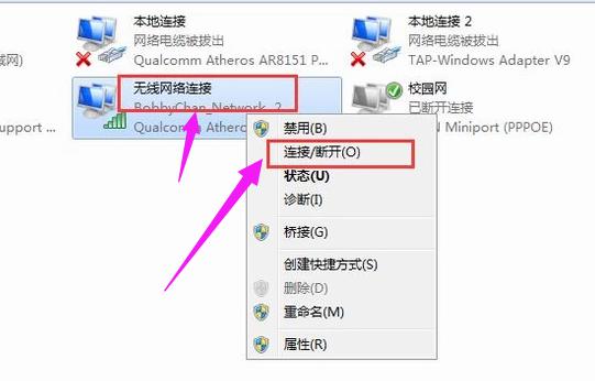 在适配器中,找到无线网络连接,点击右键,在弹出的菜单中,点击“连接/断开”。