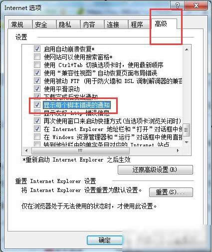 打开之后就点“高级”,然后在设置项中滑动滑块,找到如图所示两项,并选中“显示每个脚本错误的通知“并取消勾选显示友好HTTP错误通知“的选中状态,然后点”确定“。