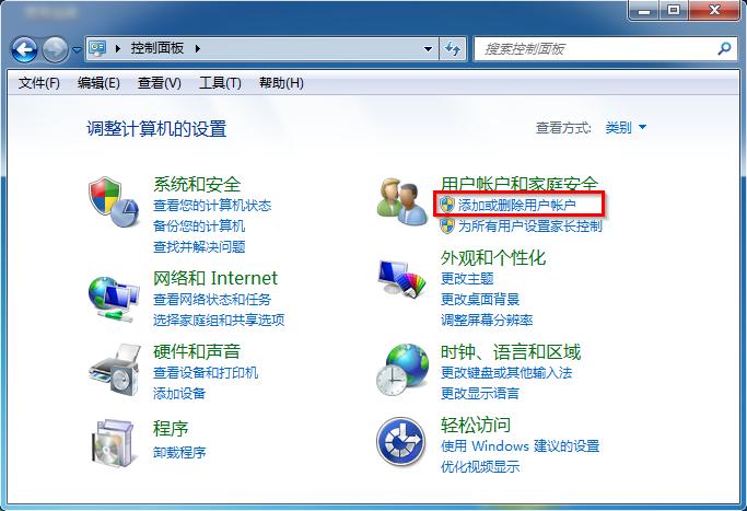 2、在控制面板界面中,选择用户账户和家庭安全下面的“添加或删除用户账户”选项。如图2所示