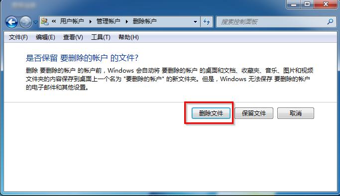 5、在删除账户界面中,“是否保留 要删除的账户 的文件”,我们选择“删除文件”。(PS:也可以选择“保留文件”,按个人意愿哦)如图5所示