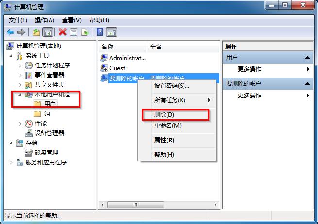 2、打开了“计算机管理”界面,我们找到“本地用户和组”下面的“用户”选项,右击看到名为“要删除的账户”,选择“删除”选项。如图9所示