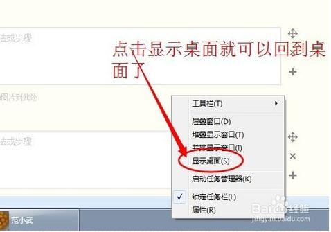 2.将鼠标移动到任务栏的空白处,点击鼠标右键,在弹出的操作列表中选择显示桌面,就回到桌面了