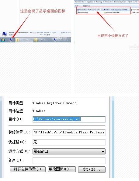 6.回到前面C:\Users\Administrator\AppData\Roaming\Microsoft\Internet Explorer\Quick Launch\User Pinned\TaskBar文件夹的快捷方式,并将这个快捷方式拖动到任务栏上,任务栏出现该出表,同时该文件夹下同时生成相同名的快捷方式2,点击属性将这两个快捷方式的属性,选择目标,在目标里面重新输入刚才的C:\Windows\showdesktop.scf,点击确定。OK了完成了,试一下点击这个图标是不是可以回到桌面了