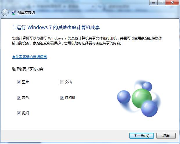 2:如图1-2所示,选择需要共享给其他用户的资源。完成创建家庭组后,大家可以随时增加、减少共享的资源。