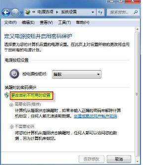 2、在唤醒时的密码保护那一块,单击“更改当前不可用的设置”(进行下面的操作,需要拥有管理员权限;如果网络是某个组织的一部分,则可能无法直接更改,需要和系统管理员取得联系。)。
