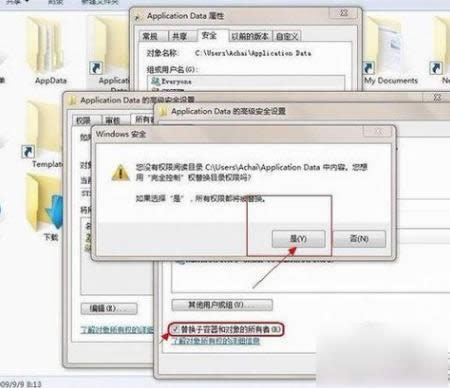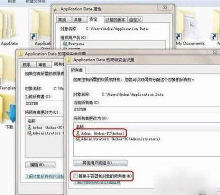 3.在新弹出的窗口中双击用户账号“Achai”,注意一定要选择下面的“替换子容器和对象的所有者”,如果不选择此项,打开此文件夹后,下面的子文件夹还是无法打开的,选好之后就点“应用”,然后再点确定即可。