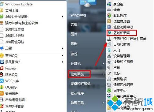 1、点击开始菜单,依次选择【控制面板】—【区域和语言】;